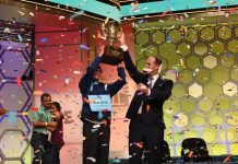 Scripps National Spelling Bee winner Karthik Nemmani lifting the trophy