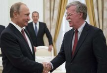 Russian President Vladimir Putin shakes hands with U.S. National security adviser John Bolton at the Kremlin in Moscow on June 27, 2018....