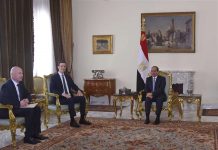 In this Thursday, June 21, 2018 photo, provided by Egypt's state news agency, MENA, Egyptian President Abdel-Fattah el-Sissi, center, meets with...