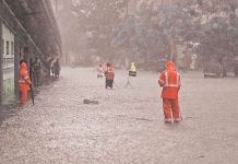 NDRF and CDRF personnel warn motorists against open manholes at Parel East on Saturday. (Express Photo by Nirmal Harindran)