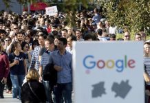 Workers stand outside the Google offices after walking out as part of a global protest over workplace issues, in London, Britain, November...