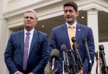House Speaker Paul Ryan, accompanied by House Majority Leader Kevin McCarthy, speaks to reporters outside the West Wing of the White House...