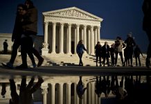 Visitors walk in front of the U.S. Supreme Court building in Washington, D.C., U.S., on Tuesday, Feb. 16, 2016. - Photographer: Andrew...