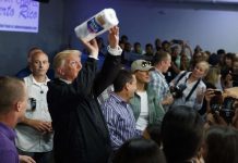 President Donald Trump tosses paper towels into a crowd as he hands out supplies for Hurricane Maria victims in Guaynabo, Puerto Rico,...