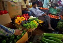 An Indian shopkeeper arranges capsicums in a whole sale vegetable market in Gauhati, India, Wednesday, Dec. 13, 2017. Retail inflation rate has...