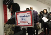 Immigrants wait in line to become US citizens at a naturalization ceremony on February 2, 2018 in New York City. U.S. Citizenship...