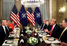 U.S. President Donald Trump holds a breakfast meeting with NATO Secretary General Jens Stoltenberg (left) at the NATO Summit on July 11,...
