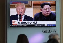 People watch a TV screen showing file footage of U.S. President Donald Trump, left, and North Korean leader Kim Jong Un, right,...