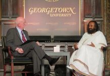 Spiritual leader Sri Sri Ravi Shankar (right) in conversation with Shaun Casey, director of Georgetown University’s Berkley Center for Religion, Peace and...