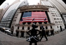 The fearless girl statue and the New York Stock Exchange (NYSE) are pictured on April 20, 2020 at Wall Street in New...
