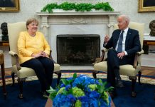 US President Joe Biden meets with German Chancellor Angela Merkel in the Oval Office of the White House on Thursday. - Evan...