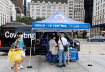 People stand at a mobile Covid 19 testing station at the Plaza Hotel in New York, July 11, 2021. - Mathias Wasik/picture-alliance/dpa...