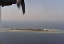 This aerial image taken from a C-130 transport plane shows a general view of Taiping island during a visit by journalists to...