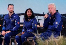 Virgin Galactic founder Richard Branson, left, receives a Virgin Galactic made astronaut wings pin from Canadian astronaut Chris Hadfield after his flight...