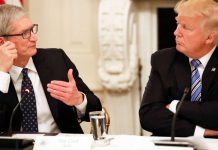 Tim Cook, Chief Executive Officer of Apple, speaks as President Donald Trump listens during an American Technology Council roundtable in the State...