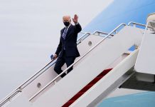 President Joe Biden waves as he arrives on Air Force One at Philadelphia International Airport in Philadelphia, Tuesday, March 16, 2021, en...