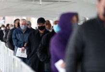People waited to enter a coronavirus vaccination site at the United Center in Chicago this week. The site was expected to administer...