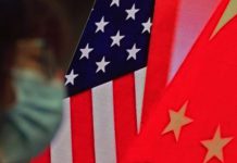 A woman wearing a face mask sits near a screen showing China and U.S. flags in Beijing, China. - Andy Wong/AP Photo
