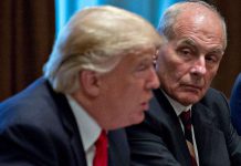 White House chief of staff John Kelly listens as U.S. President Donald Trump speaks at a briefing with senior military leaders in...