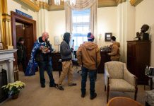 Donald Trump supporters stand in the office of House speaker Nancy Pelosi, where a laptop was stolen. - Photograph: Jim Lo Scalzo/EPA