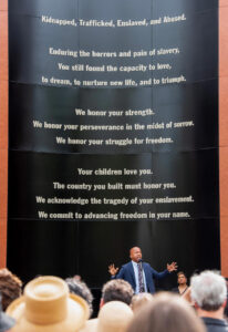 Equal Justice Initiative Executive Director Bryan Stevenson speaks as EJI dedicates its National Monument to Freedom in the Freedom Monument Sculpture Park in Montgomery, Ala., during a Juneteenth Celebration on Wednesday, June 19, 2024. The monument lists the surnames of formerly enslaved people. – Mickey Welsh, Advertiser