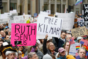 Protesters in Chicago, New York and Washington D.C. held up signs calling to “Free Kilmar,” a reference to Kilmar Abrego Garcia, a wrongfully deported Salvadoran father living in Maryland whom the Trump administration has labeled as a MS-13 gang member. Abrego Garcia’s family and his attorneys have denied these claims.