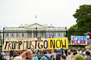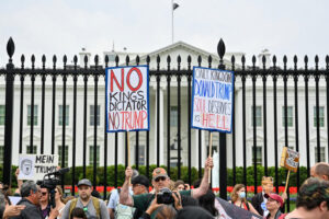 “No kings, no dictator, no Trump!” one demonstrator’s sign read just outside the White House gate. Another sign nearby depicted Trump with a Hitler-esque mustache along with the words: “Mein Trumpf.”