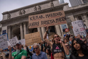 Some demonstrators held up signs saying “due process is for everyone” while others carried signs boasting the names of international students who have been detained by immigration enforcement authorities. Columbia graduate student Mahmoud Khalil, Tufts University doctoral student Rumeysa Ozturk, and Columbia senior Mohsen Mahdawi were among the names plastered on signs. Mahdawi, a student activist and green card holder, was arrested this week when he arrived for a citizenship interview. Some protesters held up signs saying they were “kidnapped” by Immigration and Customs Enforcement.