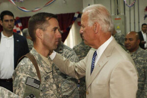 KHALID MOHAMMED/AFP via Getty – Then-Vice President Joe Biden talks with his son, U.S. Army Capt. Beau Biden, near Baghdad on July 4, 2009