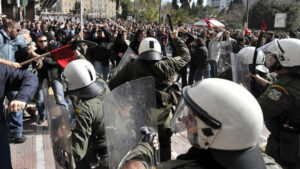 Protesters clash with riot police during a demonstration in the center of Athens on February 24, 2010. Greece ground to a halt on February 24 as unions staged a one-day general strike and thousands of demonstrators took to the streets to protest austerity measures designed to tame a public debt crisis. Schools, government offices and courthouses were all closed while there was also major disruption to public transport, banks, hospitals and state-owned companies. – Aris Messinis/AFP/Getty Images