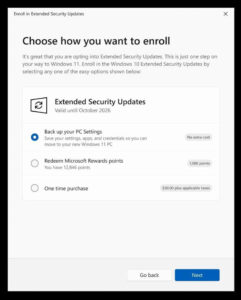Below that messaging is a link to enroll, which will pop-up the Extended Security Updates enrollment wizard. You’ll need to decide whether you want to sync your settings with OneDrive, pay $30 or use 1,000 Microsoft Rewards points for the ESU program.