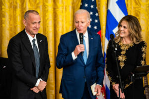 President Joe Biden, with actor Tom Hanks and his wife, the actress and musician Rita Wilson, at the White House in 2023. – Demetrius Freeman/The Washington Post