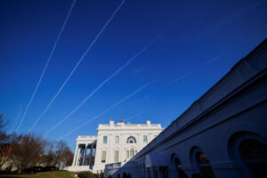 FILE PHOTO: A view shows contrails left behind by airplanes in the sky over the White House, in Washington, D.C., U.S., February 28, 2025. REUTERS/Brian Snyder/ File Photo