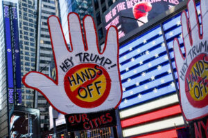 People carry hand-shaped placards in Times Square, on the day of a “No Kings” protest against U.S. President Donald Trump’s policies, in New York City, U.S., October 18, 2025. REUTERS/Shannon Stapleton/Thomson Reuters