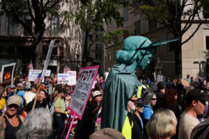 Protester Aliston Elliot, wearing a Statue of Liberty headpiece and holding a “No Wannabe Dictators” sign, said: “We want to show our support for democracy and for fighting (for) what is right. I’m against the overreach of power.”