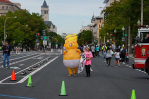 A woman holding a placard walks with a person wearing an inflatable costume depicting U.S. President Donald Trump ahead of a “No Kings” protest against U.S. President Donald Trump’s policies, in Washington, D.C., U.S., October 18, 2025. REUTERS/Leah Millis/Thomson Reuters