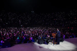Zohran Mamdani speaks at a campaign rally at Forest Hills Stadium in Queens, New York, on 26 October 2025. Photograph: Julius Constantine Motal/The Guardian