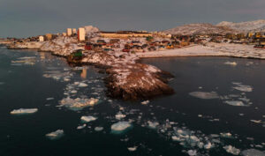 An aerial view shows ice blocks in the water near the coastline of the city of Nuuk, Greenland. Ina FASSBENDER / AFP via Getty Images