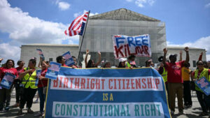 People hold a banner as they participate in a protest outside the US Supreme Court over President Donald Trump’s move to end birthright citizenship on May 15, 2025. – Jim Watson/AFP/Getty Images/File