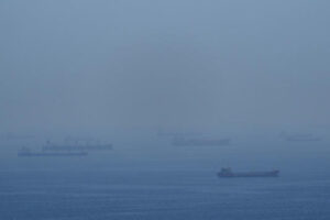 Tankers anchored in the Strait of Hormuz on April 18. (AP Photo)