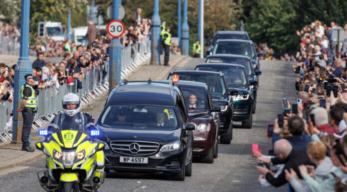 A cortege carrying the coffin of Queen Elizabeth II passes over King George VI Bridge while en route from Balmoral Castle to Edinburgh, Scotland.