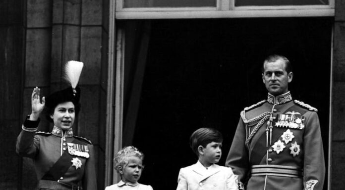 FILE PHOTO: Queen Elizabeth II in uniform as Colonel Chief of the Grenadier Guards, with Prince Charles, Princess Anne and The Prince Philip, Duke of Edinburgh, waving from the balcony of Buckingham Palace, in London, June, 1953. - Fox Photos/Getty Images