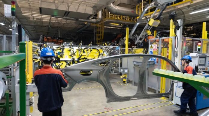 The production line at a car factory in Hangzhou, China, in October. Exports to the United States fell, but rose to much of the rest of the world. - Chang W. Lee/NYT