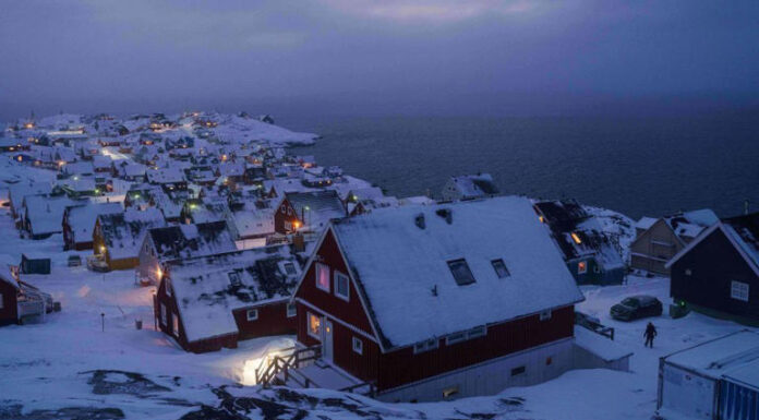 Houses covered by snow are seen on the coast of a sea inlet of Nuuk, Greenland, on Monday. - Evgeniy Maloletka/AP
