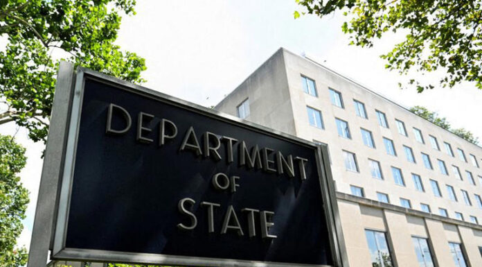 FILE PHOTO: A general view of a U.S. State Department sign outside the U.S. State Department building in Washington, D.C., U.S., July 11, 2025. REUTERS/Annabelle Gordon/File Photo