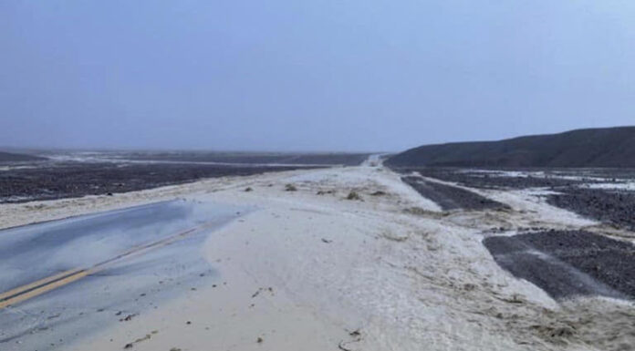 In this photo provided by the National Park Service, Highway 190 is closed due to flash flooding in Death Valley National Park, Calif., Friday, Aug. 5, 2022. Heavy rainfall triggered flash flooding that closed several roads in Death Valley National Park on Friday near the California-Nevada line. The National Weather Service reported that all park roads had...