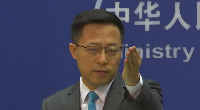 FILE - Chinese Foreign Ministry spokesperson Zhao Lijian gestures during a press conference at the Ministry of Foreign Affairs in Beijing on July 6, 2022. The United States is “the biggest threat to world peace, stability and development," China said Thursday, July 7, continuing its sharp rhetoric in response to U.S. accusations of Chinese spying and threats...