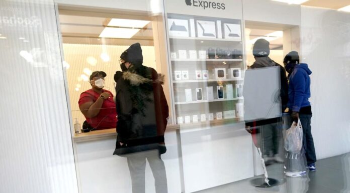 Customers pick up online orders at the Apple Store at the Towson Town Center, Dec. 15, 2020, in Towson, Md. Apple store employees in the Baltimore suburb voted to unionize by a nearly 2-to-1 margin on Saturday, June 18, 2022. (AP Photo/Julio Cortez, file)