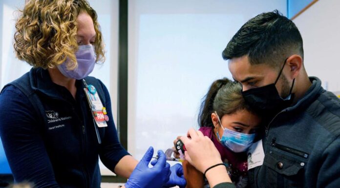Kidney transplant patient Sophia Silvaamaya, 5, held by her father, Pedro, is vaccinated by nurse Kelly Vanderwende on Nov. 3, 2021, at Children's National Hospital in Washington.- Carolyn Kaster, AP