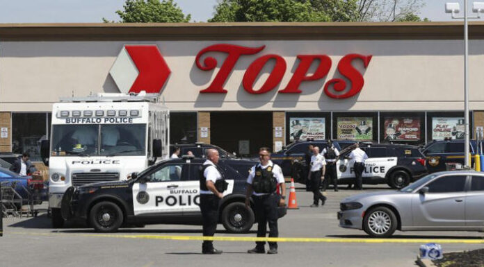Police stand in the parking lot of a mass shooting on Saturday afternoon at a supermarket in Buffalo, New York on Sunday, May 15 2022. Ten people were killed and three injured during a mass shooting at a supermarket on Saturday afternoon in Buffalo. Photo by Aaron Josefczyk/UPI